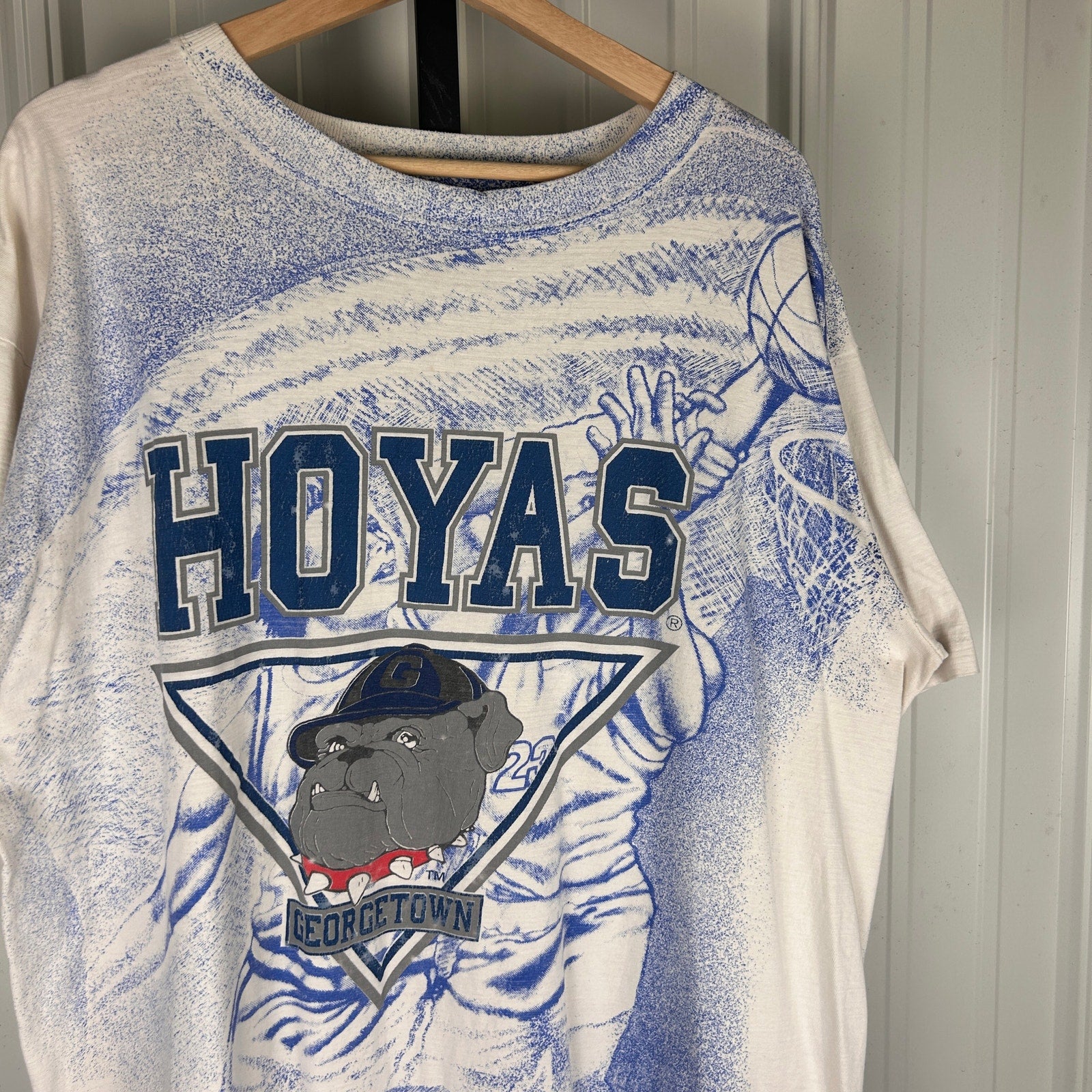 Georgetown Hoyas Vintage AOP NCAA Basketball Graphic XXL Shirt (Has Slight Yellowing in Armpits And Loose Stitching Near Bottom, Has Not Been Stain Treated)