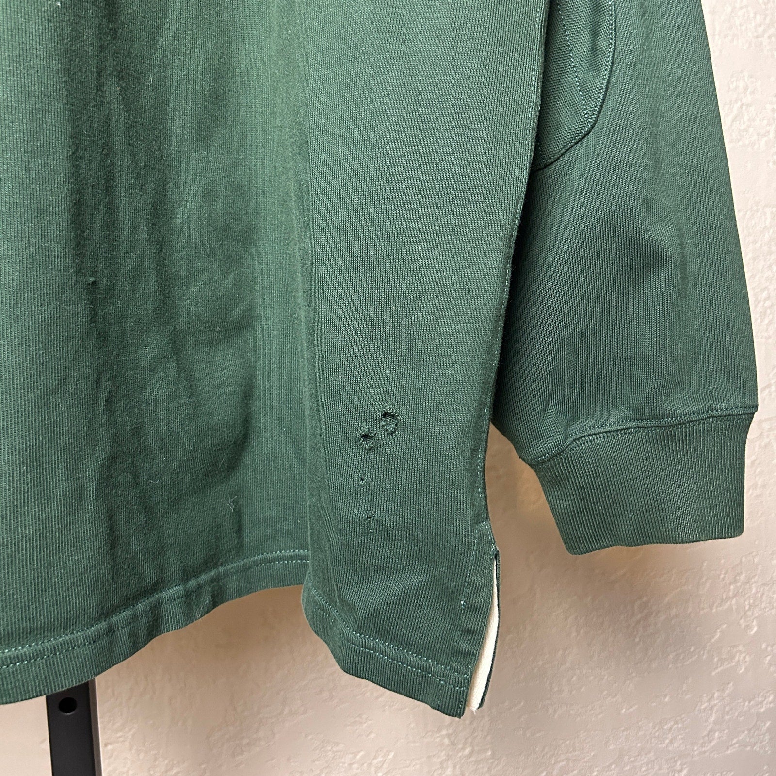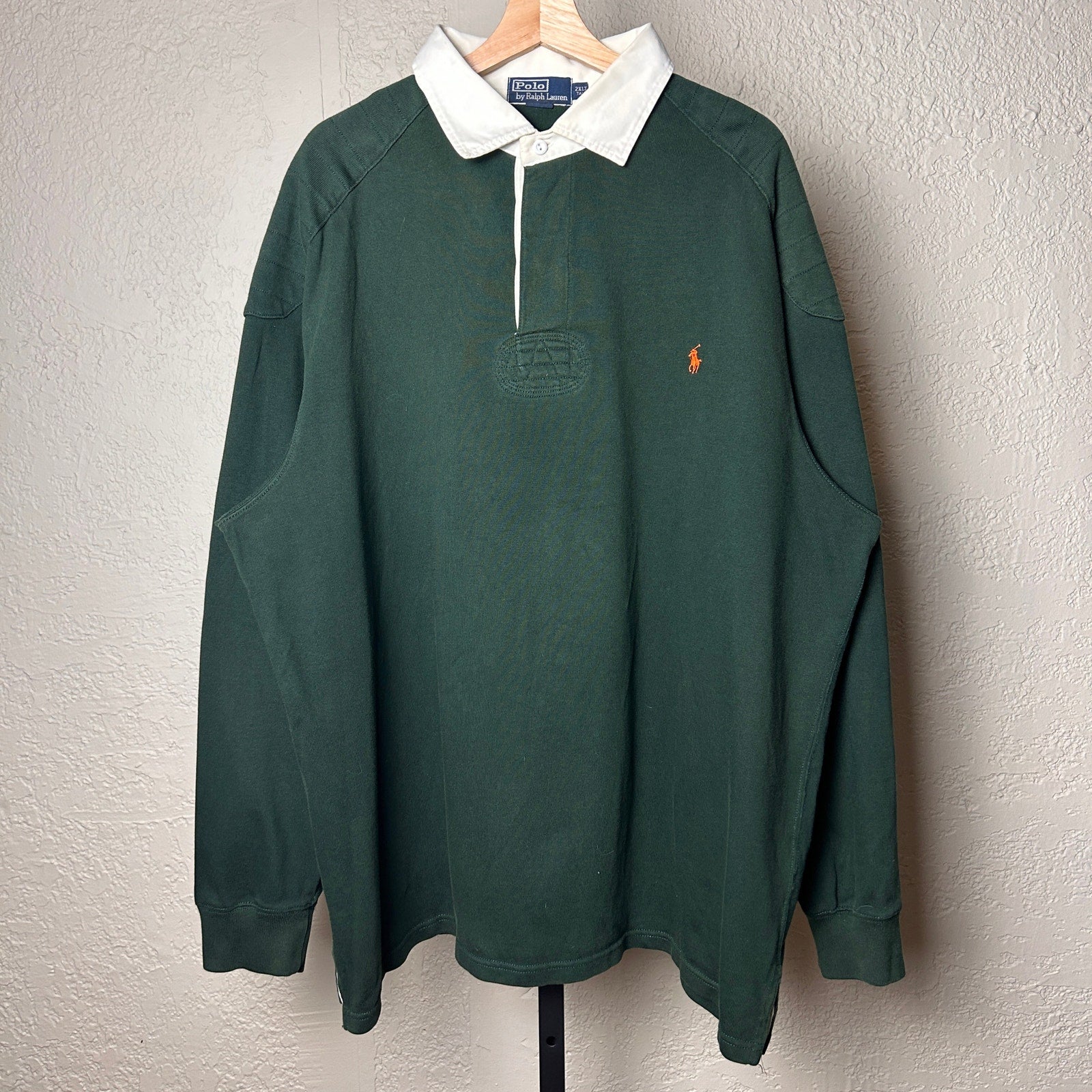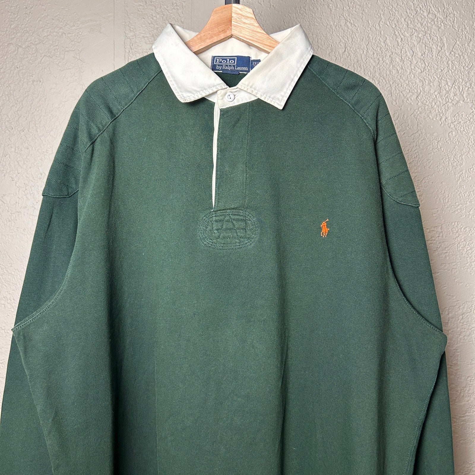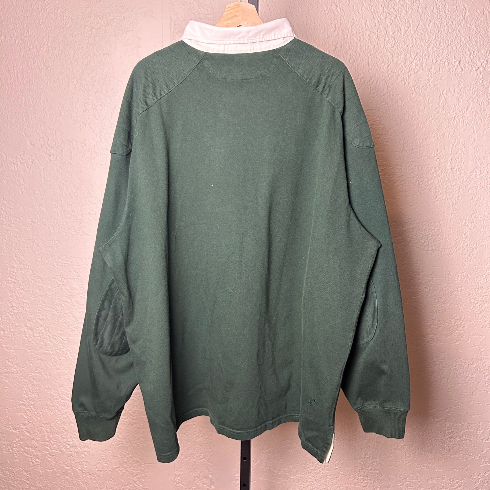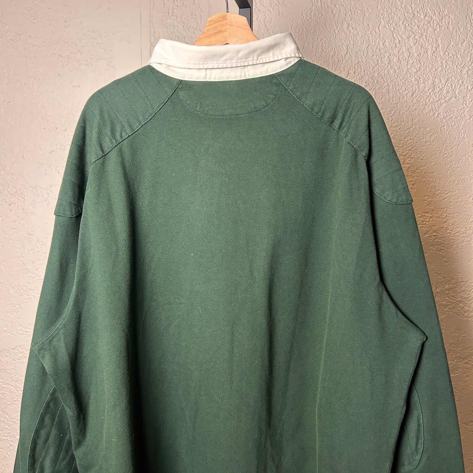 Polo Ralph Lauren Vintage 90s Rugby Polo Forest Green 2XL Tall Padded Shoulders and Elbows Longsleeve Shirt (Minor Holes on Bottom Back Side)