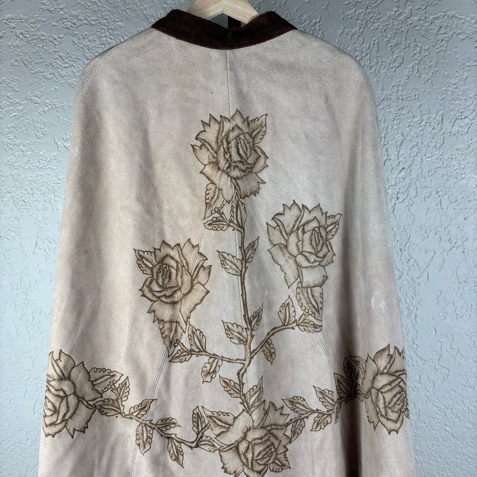 Vintage Suede Leather Rose Art Pyrography Poncho Cape With Fringe Fits Medium to Large